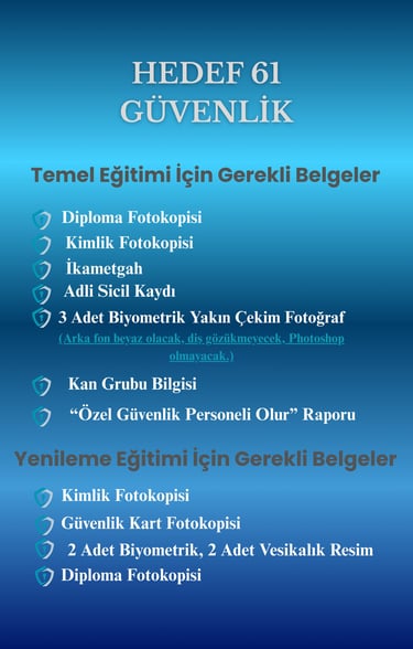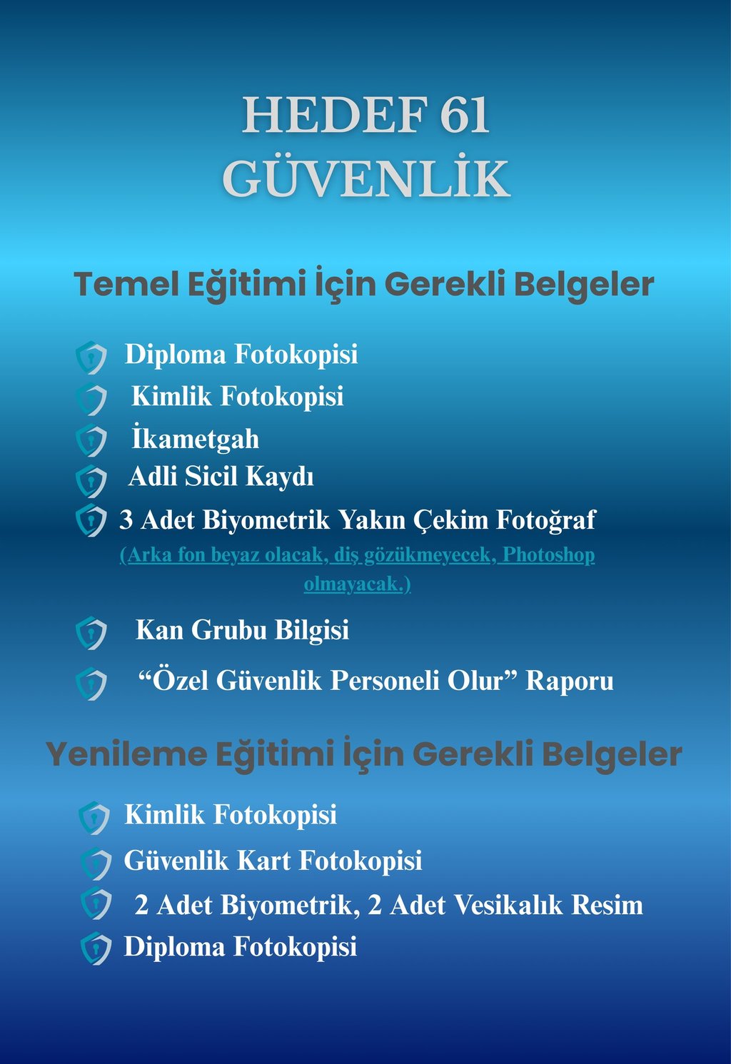 Hedef 61 Güvenlik, Trabzon’un Ortahisar ilçesinde yer alan Gazipaşa Mahallesi Bekaroğlu Sokak No: 12/21 adresindeki merkezinde, güvenlik sektöründe uzun yıllara dayanan deneyimiyle profesyonel eğitim hizmetleri sunmaktadır. Uzman ve deneyimli kadrosuyla silahlı ve silahsız özel güvenlik eğitimleri veren kurumumuz, güvenlik alanında kariyer yapmak isteyen bireylerin mesleki gelişimlerine katkı sağlamayı amaçlamaktadır. Güvenlik sektöründe gerekli tüm bilgi, beceri ve yetkinlikleri kazandırmak için Hedef 61 Güvenlik olarak her zaman yanınızdayız.